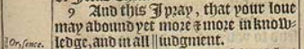 9 And this I pray, that your loue may abound yet more & more in knowledge, and in all || iudgment.[||Or, sence.]