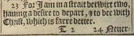 23 For I am in a strait betwixt two, hauing a desire to depart, & to bee with Christ, which is farre better.