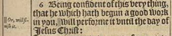 6 Being confident of this very thing, that he which hath begun a good work in you, ||will performe it vntil the day of Iesus Christ:[||Or, will finish it.]
