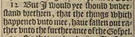12 But I would yee should vnderstand brethren, that the things which happened vnto mee, haue fallen out rather vnto the furtherance of the Gospel.