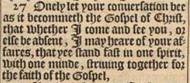 27 Onely let your conuersation bee as it becommeth the Gospel of Christ, that whether I come and see you, or else be absent, I may heare of your affaires, that yee stand fast in one spirit, with one minde, striuing together for the faith of the Gospel,