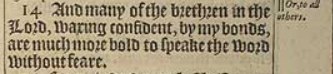 14 And many of the brethren in the Lord, waxing confident, by my bonds, are much more bold to speake the word without feare.