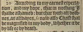20 According to my earnest expectation, and my hope, that in nothing I shalbe ashamed: but that with all boldnes, as alwayes, so now also Christ shal be magnified in my body, whether it be by life or by death.