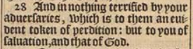 28 And in nothing terrified by your aduersaries, which is to them an euident token of perdition: but to you of saluation, and that of God.