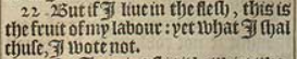 22 But if I liue in the flesh, this is the fruit of my labour: yet what I shal chuse, I wote not.