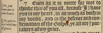 7 Euen as it is meete for mee to thinke this of you all, because I || haue you in my heart, in as much as both in my bonds, and in the defence and confirmation of the Gospel, ye all are || partakers of my grace. [||Or, you haue me in your heart. , ||Or, partakers with me of grace.]
