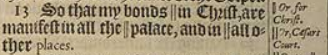 13 So that my bonds ||in Christ, are manifest in all the ||palace, and in ||all other places.[||Or. for Christ. , ||Or, Cæsars Court. , Or, to all others.