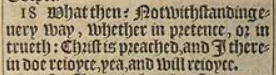 18 What then? Notwithstanding euery way, whether in pretence, or in trueth: Christ is preached, and I therein doe reioyce, yea, and will reioyce.