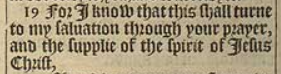 19 For I know that this shall turne to my saluation through your prayer, and the supplie of the spirit of Iesus Christ,