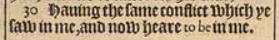 30 Hauing the same conflict which ye saw in me, and now heare to be in me.