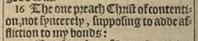 16 The one preach Christ of contention, not syncerely, supposing to adde affliction to my bonds: