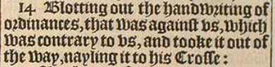 14 Blotting out the handwriting of ordinances, that was against vs, which was contrary to vs, and tooke it out of the way, nayling it to his Crosse: