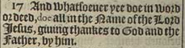 17 And whatsoeuer yee doe in word or deed, doe all in the Name of the Lord Iesus, giuing thankes to God and the Father, by him.