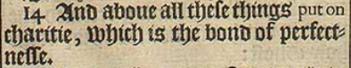 14 And aboue all these things put on charitie, which is the bond of perfectnesse.
