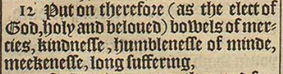 12 Put on therefore (as the elect of God, holy and beloued) bowels of mercies, kindnesse, humblenesse of minde, meekenesse, long suffering,