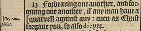13 Forbearing one another, and forgiuing one another, if any man haue a || quarrell against any: euen as Christ forgaue you, so also doe yee.[||Or, complaint.]