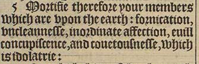 5 Mortifie therefore your members which are vpon the earth: fornication, vncleannesse, inordinate affection, euill concupiscence, and couetousnesse, which is idolatrie: