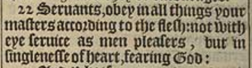 22 Seruants, obey in all things your masters according to the flesh: not with eye seruice as men pleasers, but in singlenesse of heart, fearing God: