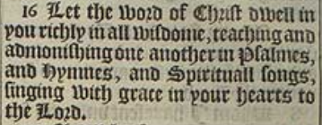 16 Let the word of Christ dwell in you richly in all wisdome, teaching and admonishing one another in Psalmes, and Hymnes, and Spirituall songs, singing with grace in your hearts to the Lord.