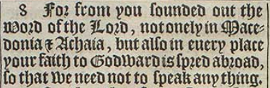 8 For from you sounded out the Word of the Lord, not onely in Macedonia & Achaia, but also in euery place your faith to Godward is spred abroad, so that we need not to speak any thing.