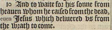 10 And to waite for his sonne from heauen whom he raised from the dead, euen Iesus which deliuered vs from the wrath to come.