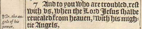 7 And to you who are troubled, rest with vs, when the Lord Iesus shalbe reuealed from heauen, +with his mightie Angels, [+Gr. the angels of his power.]