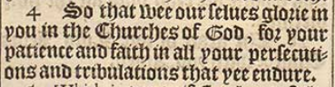 4 So that wee our selues glorie in you in the Churches of God, for your patience and faith in all your persecutions and tribulations that yee endure.