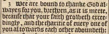 3 Wee are bound to thanke God alwayes for you, brethren, as it is meete, because that your faith groweth exceedingly, and the charitie of euery one of you al towards each other aboundeth: