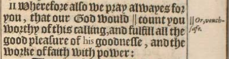 11 Wherefore also we pray alwayes for you, that our God would || count you worthy of this calling, and fulfill all the good pleasure of his goodnesse, and the worke of faith with power:[||Or, vouchsafe.]