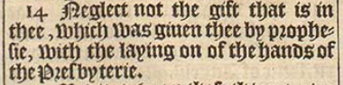14 Neglect not the gift that is in thee, which was giuen thee by prophesie, with the laying on of the hands of the Presbyterie.