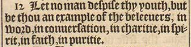 12 Let no man despise thy youth, but be thou an example of the beleeuers, in word, in conuersation, in charitie, in spirit, in faith, in puritie.