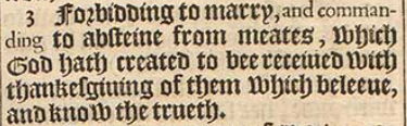 3 Forbidding to marry, and commanding to absteine from meates, which God hath created to bee receiued with thankesgiuing of them which beleeue, and know the trueth.