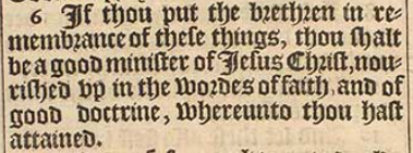 6 If thou put the brethren in remembrance of these things, thou shalt be a good minister of Iesus Christ, nourished vp in the wordes of faith, and of good doctrine, whereunto thou hast attained.