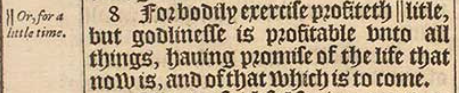 8 For bodily exercise profiteth || litle, but godlinesse is profitable vnto all things, hauing promise of the life that now is, and of that which is to come.[|| Or, for a little time.]