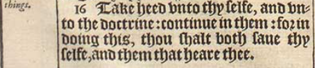 16 Take heed vnto thy selfe, and vnto the doctrine: continue in them: for in doing this, thou shalt both saue thy selfe, and them that heare thee.