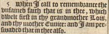 5 When I call to remembrance the vnfained faith that is in thee, which dwelt first in thy grandmother Lois, and thy mother Eunice: and I am perswaded that in thee also.