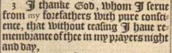 3 I thanke God, whom I serue from my forefathers with pure conscience, that without ceasing I haue remembrance of thee in my prayers night and day,