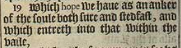19 Which hope we haue as an anker of the soule both sure and stedfast, and which entreth into that within the vaile,
