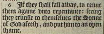 6 If they shall fall away, to renue them againe vnto repentance: seeing they crucifie to themselues the Sonne of God afresh, and put him to an open shame.