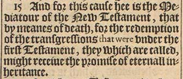 15 And for this cause hee is the Mediatour of the New Testament, that by meanes of death, for the redemption of the transgressions that were vnder the first Testament, they which are called, might receiue the promise of eternall inheritance.
