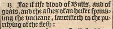 13 For if the blood of Bulls, and of goats, and the ashes of an heifer sprinkling the vncleane, sanctifieth to the purifying of the flesh: