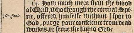 14 How much more shall the blood of Christ, who through the eternal Spirit, offered himselfe without || spot to God, purge your conscience from dead workes, to serue the liuing God?[||Or, fault.]