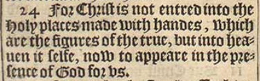 24 For Christ is not entred into the Holy places made with handes, which are the figures of the true, but into heauen it selfe, now to appeare in the presence of God for vs.