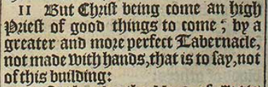 11 But Christ being come an high Priest of good things to come, by a greater and more perfect Tabernacle, not made with hands, that is to say, not of this building: