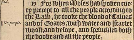 19 For when Moses had spoken euery precept to all the people according to the Law, he tooke the blood of Calues and of Goates, with water and ||scarlet wooll, and hysope, and sprinckled both the booke and all the people,[||Or, purple.]
