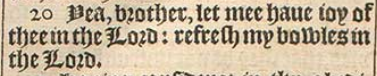 20 Yea, brother, let mee haue ioy of thee in the Lord: refresh my bowles in the Lord.