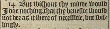 14 But without thy minde would I doe nothing, that thy benefite should not bee as it were of necessitie, but willingly.