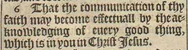 6 That the communication of thy faith may become effectuall by the acknowledging of euery good thing, which is in you in Christ Iesus.