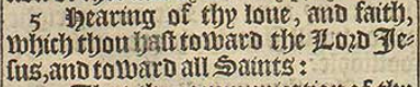 5 Hearing of thy loue, and faith, which thou hast toward the Lord Iesus, and toward all Saints: