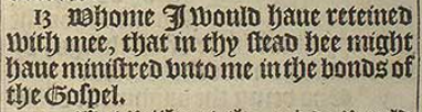 13 Whome I would haue reteined with mee, that in thy stead hee might haue ministred vnto me in the bonds of the Gospel.